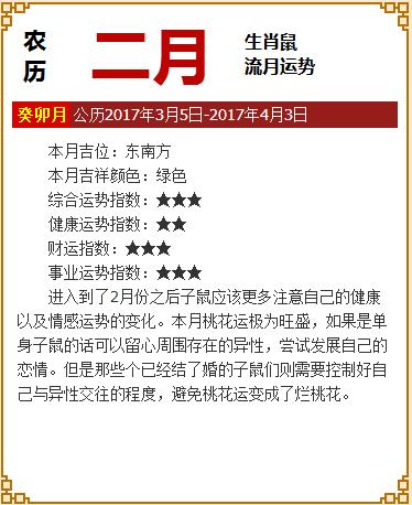 爱情:本月不利生肖鼠男生的爱情运,劫财透出月干合住了生肖鼠的偏财星,多主爱情上多遭遇竞争,甚至有一定的竞争不利。至于生肖鼠女生的话,异性星藏于月建,故需要自己去主动,否则难有大的突破。